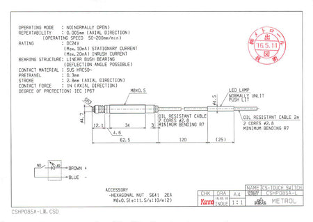 Contact rating | DC5V - DC24V Steady current: 10mA or less (Rush current: 20mA or less) When using the switch with LED, limit the current below 10mA |