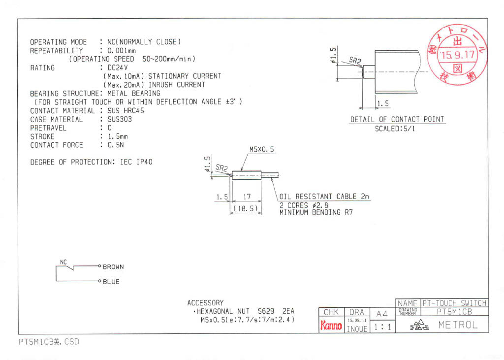 Cable | Core-wire cable: 0.5m(x2) Oil-resistant φ0.6, Tensile strength 15N Cabtyre cable: 2m Oil-resistant φ2.8 / 2cores, Tensile strength 30N, Minimum bending R7 |