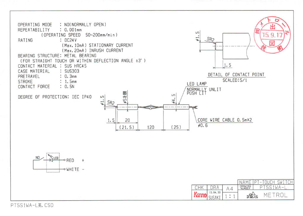 Contact rating | DC5V - DC24V Steady current: 10mA or less (Rush current: 20mA or less) When using the switch with LED, limit the current below 10mA |
