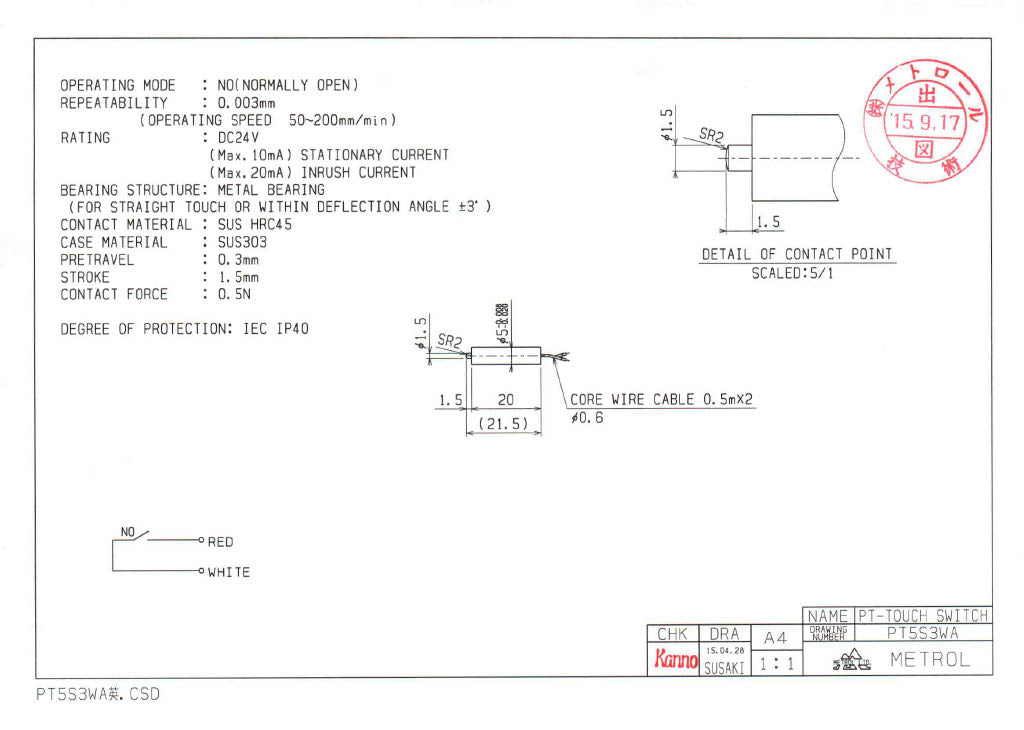 Cable | Core-wire cable: 0.5m(x2) Oil-resistant φ0.6, Tensile strength 15N Cabtyre cable: 2m Oil-resistant φ2.8 / 2cores, Tensile strength 30N, Minimum bending R7 |