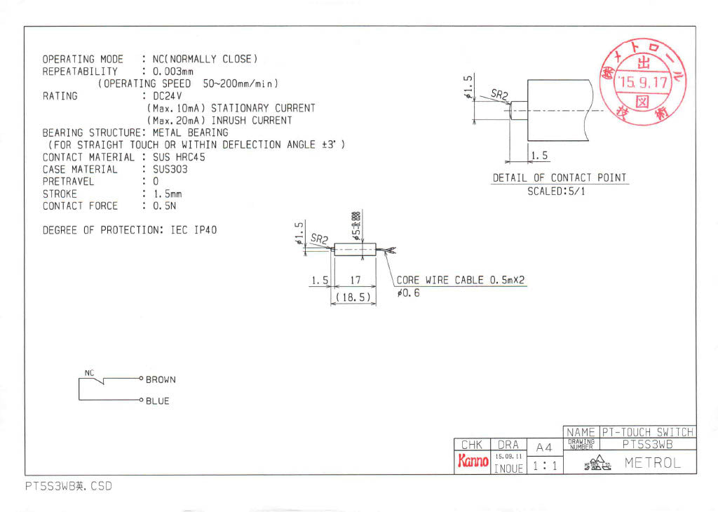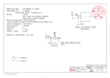 Cable | Core-wire cable: 0.5m(x2) Oil-resistant φ0.6, Tensile strength 15N Cabtyre cable: 2m Oil-resistant φ2.8 / 2cores, Tensile strength 30N, Minimum bending R7 |