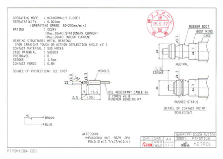 Cable | Core-wire cable: 0.5m(x2) Oil-resistant φ0.6, Tensile strength 15N Cabtyre cable: 2m Oil-resistant φ2.8 / 2cores, Tensile strength 30N, Minimum bending R7 |