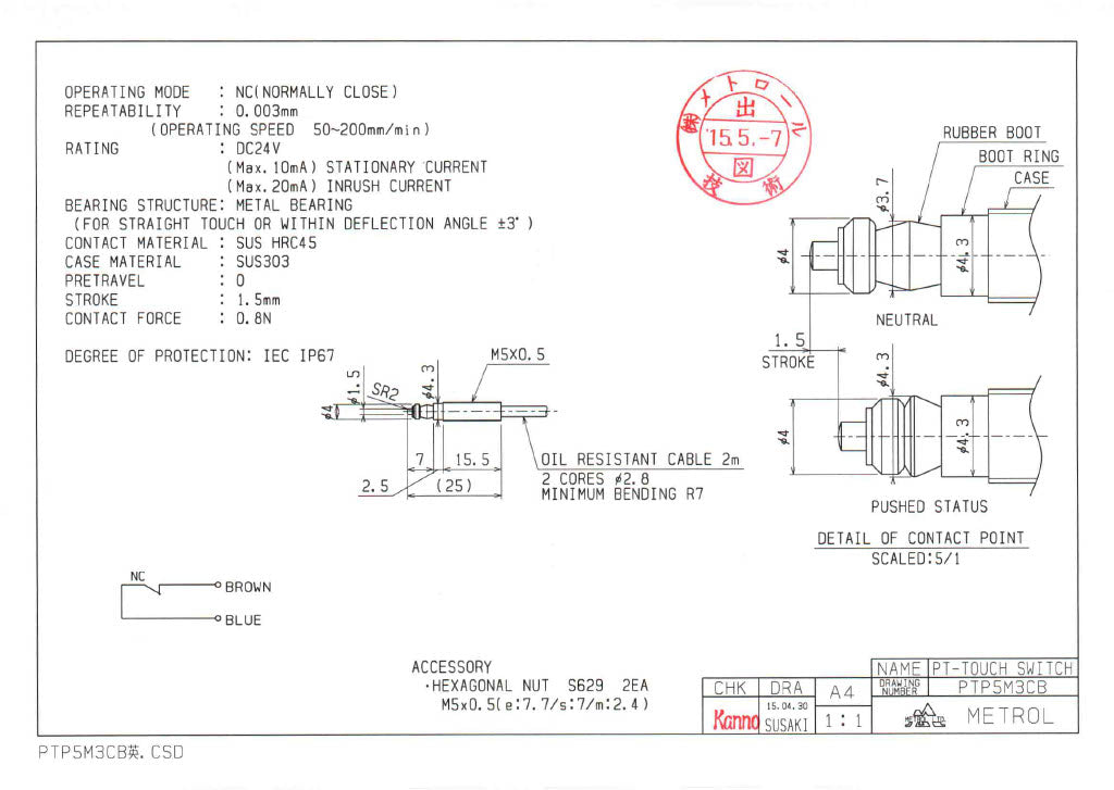 Cable | Core-wire cable: 0.5m(x2) Oil-resistant φ0.6, Tensile strength 15N Cabtyre cable: 2m Oil-resistant φ2.8 / 2cores, Tensile strength 30N, Minimum bending R7 |