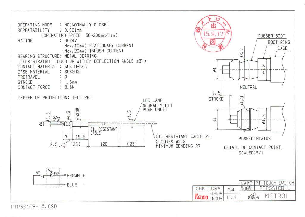 Cable | Core-wire cable: 0.5m(x2) Oil-resistant φ0.6, Tensile strength 15N Cabtyre cable: 2m Oil-resistant φ2.8 / 2cores, Tensile strength 30N, Minimum bending R7 |